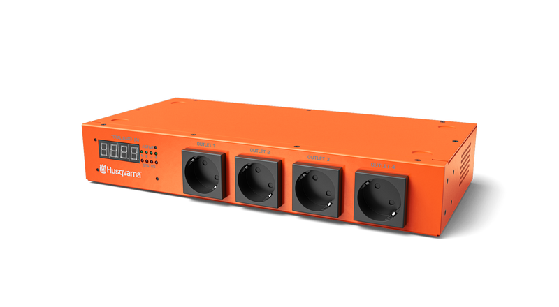 Husqvarna 230-PDMX4 gör att du kan ansluta flera laddare utan att riskera att överbelasta en elektrisk krets. Genom att detektera ampereuttaget för varje batteri distribuerar den ström till varje batteriladdare, vilket möjliggör effektiv laddning utan att du behöver modifiera säkringssystemet i din verkstad. Anslut upp till fyra enheter till en enda PDM, som på ett intelligent sätt håller den maximala kretsbelastningen under 16 A, även när flera laddningsaggregat används samtidigt. Tack vare lastavkänningstekniken växlar systemet automatiskt ström från fulladdade enheter till de som behöver ström, vilket gör det möjligt att ladda över natten utan att behöva byta batteri. Genom att använda Husqvarna 230-PDM moteringssats multi (finns som tillbehör) ger det här skalbara systemet möjlighet att dubbla eller fyrdubbla laddningskapaciteten.
