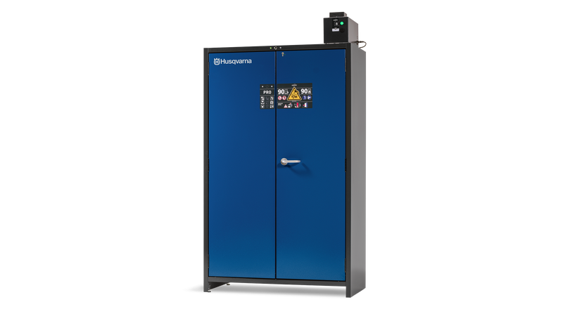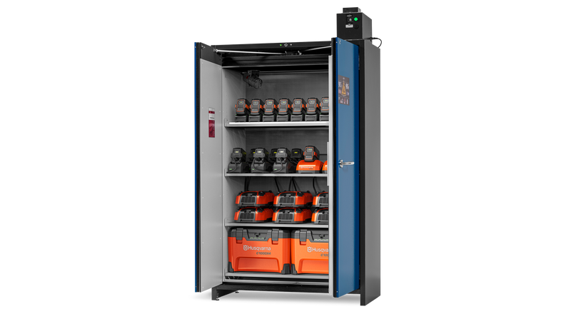Husqvarnas batteriladdningsskåp L är konstruerat för säker och godkänd förvaring och laddning av litiumjonbatterier. Detta rymliga 230V-skåp erbjuder 90 minuters brandmotstånd från utsidan in och inifrån och ut*. Utrustad med en rökdetektor och en temperatursensor som ger tidig upptäckt av begynnande bränder och ventilationsfel. Brandsläckningssystemet utlöses automatiskt vid brand, medan larmsystemet ser till att larm på plats skickas omgående. Dessutom upprätthåller det aktiva ventilationssystemet optimala förhållanden för batterier och laddare, vilket förhindrar värmeuppbyggnad under laddningsprocessen. Grenuttag och höjdjusterbara hyllor för skräddarsydda förvaringslösningar ingår. – – *Enligt EN-14470-1 och EN-13631