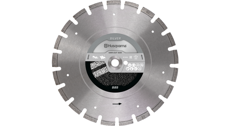 Vari-Cut S85 är en del i silver-serien för klingor och är speciellt utformad med bredare slitsar för bättre kapning av asfalt, färsk betong och andra mycket abrasiva användningsområden. Klingan har ett skyddssegment som förhindrar underskärning.