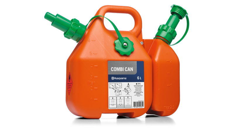 Denna kombidunk är försedd med ett effektivt överfyllningsskydd. När tanken är full stängs tillförseln automatiskt av och du kan lyfta upp dunken utan att spilla. Dunkarna kan skiljas från varandra. Mellan dunkarna finns plats för filar och andra verktyg.
