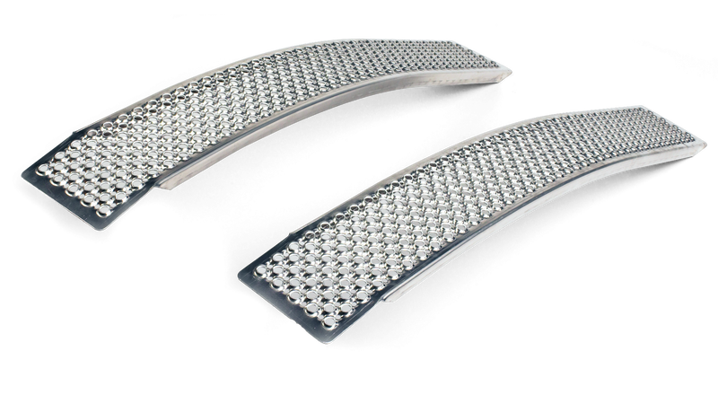 Böjda påkörningsramper gjorda av aluminium med en halkfri yta, vilket göra att alla däck får ett säkert grepp även i våta och halkiga miljöer. Påkörningsramperna passar väl att användas till släpvagnar med en höjd upp till 700 mm och klarar max total last på 450 kg/par.