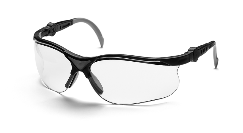 Skyddsglasögon med repfria, klara linser. Med bågar som kan förlängas och linser som kan vinklas. Godkända enligt EN 166, ANSI Z87+.