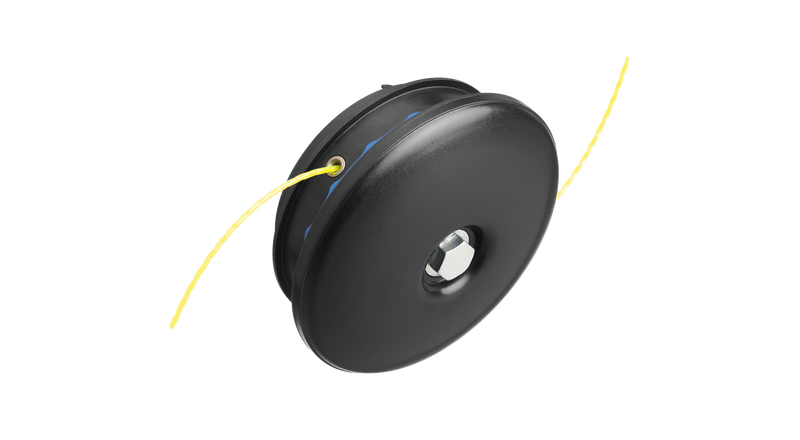 Trimmerhuvud med manuell trådmatning. Användaren matar ut tråden manuellt genom att trycka på trådmatningsknappen och dra i tråden.